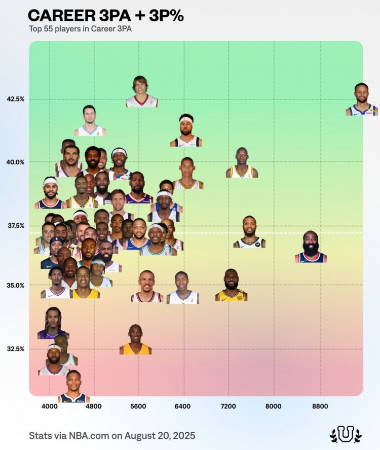 8月21日消息,数据媒体NBA University近日公布一组数据,统计了NBA历史三分出手次数前55位球员的生涯命中率排名。