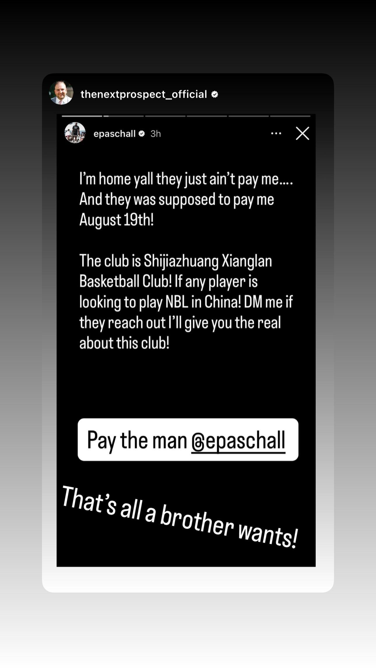 帕斯卡尔也非常气愤,他也在社媒上写道:“我已经回家了,但是他们还是没有付我薪水,他们本该在8月19日支付的。这家俱乐部就是石家庄翔蓝,如果哪位球员接下来要去中国NBL联赛打球,一定来私信我,我会告诉你所有关于这家俱乐部的真相!”