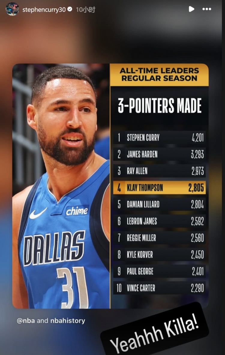 克莱三分命中数超越利拉德&上升至历史第四!库里祝贺:耶 杀手! xiaoqiao 2026年01月18日 04:22 46 0 1月17日讯 昨天,独行侠主场144-122战胜爵士。在本场比赛中,克莱出战23分钟18中11,三分13中6砍下26分6助攻。克莱的生涯三分球命中数超越利拉德,上升至NBA历史第四位;今天,库里转发评论道:“耶,杀手!”