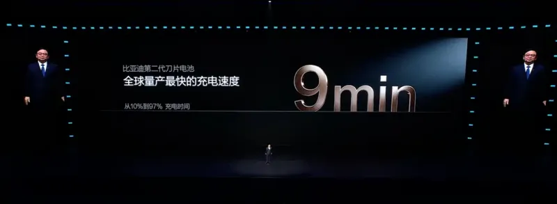 比亚迪官方宣布,第二代刀片电池从10%到70%,充电时间仅需5分钟,而从10%到97%,充电时间仅需9分钟,是全球量产最快的充电速度。