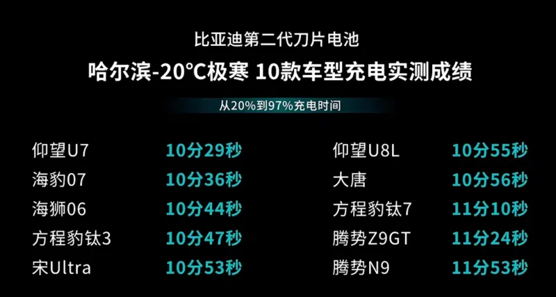 而在北方极寒地区,比亚迪大唐在-20℃气温经过24小时冷冻之后,从20%充电到97%,实测时间仅需11分7秒。仰望U7、腾势N9、方程豹钛3、海狮06、宋Ultra等车型在相同工况下,充电时间均在11分钟左右。