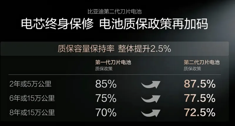 为消除用户疑虑,比亚迪将第二代刀片电池质保政策再加码,质保容量保持率整体提升2.5%。