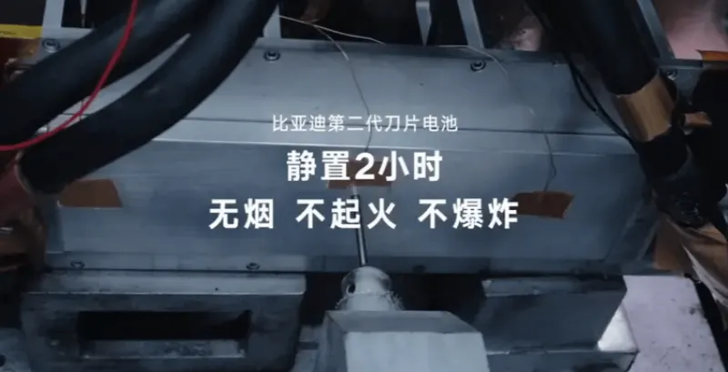 在安全性方面,第二代刀片电池在闪充同时进行针刺实验,针刺实验后静置2小时,电池无烟、不起火、不爆炸,整体性能10倍于新国标。