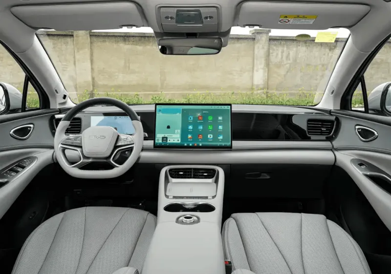 内饰方面,提供海盐灰、暮云灰两款内饰颜色,同样是王朝家族的标志性设计,中控台面黑色高光材质,车内提供动感的氛围灯,全系标配15.6英寸大尺寸的悬浮屏,多种应用生态,支持四音区语音交互。