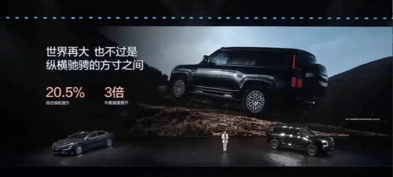 动力方面,新车新车搭载了“易四方”动力系统,即四轮由四个电机独立驱动,且每个电机都可以独立控制单个车轮,综合功率880千瓦,综合扭矩1280牛·米,0-100km/h仅需要3.6秒。新车配备了2.0升涡轮增压增程发电机,CLTC纯电续航180km。