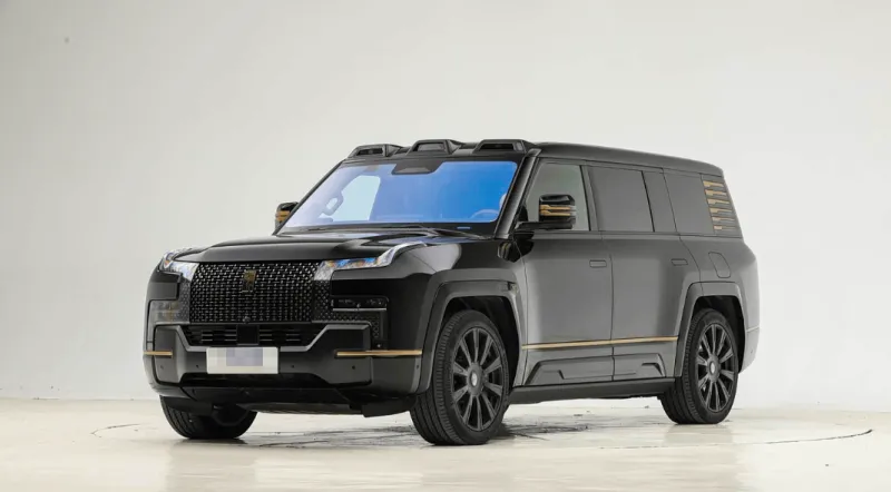 外观方面,2026款仰望U8L延续现款车型的设计,其采用黑色与金色的双色搭配,并引入24K真金打造的车标,提升其尊贵感。整体弱化了越野风格,车身尺寸,车辆长宽高分别为5400/2049/1921mm,轴距为3250mm。
